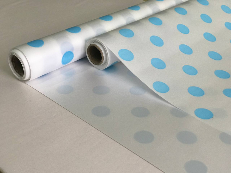 Пленка матовая с рисунком белая-горох крупный небесно-голубой 580мм/12м±5% 50мкр