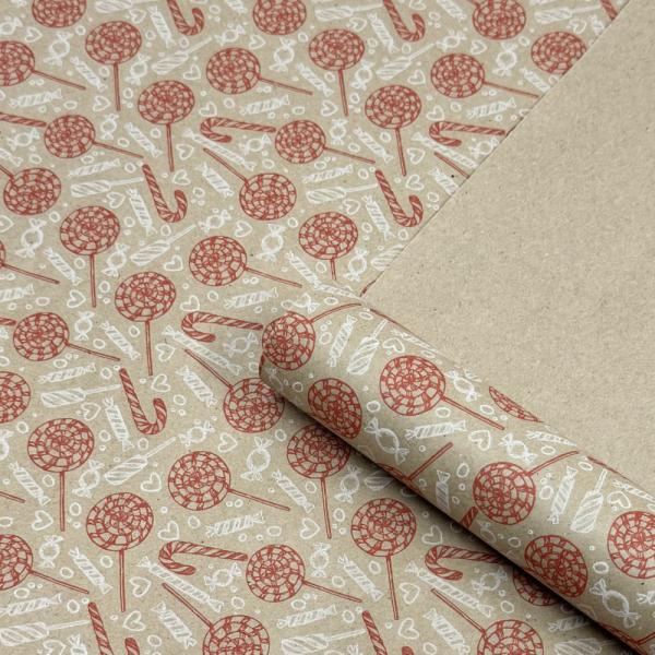 Упаковочная новогодняя бумага "Конфеты" красно-белая на коричневом 70см/60пл/10м