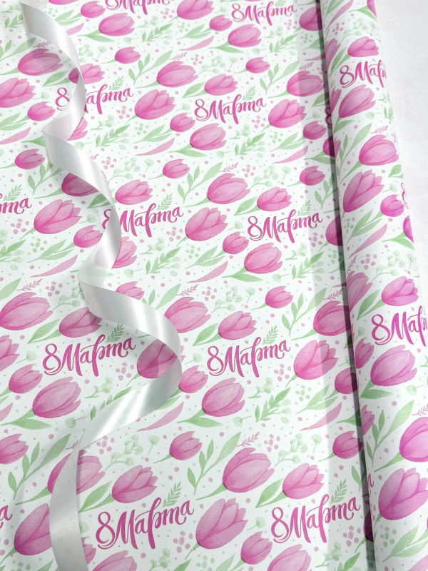 Крафт бумага 8 Марта акварель розовый/зеленый на белом фоне 700мм/60гр/10м ± 5%