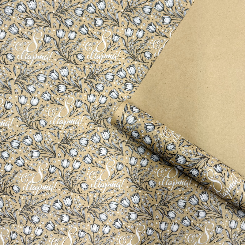 Крафт бумага 8 Марта! белый/черный на коричневом фоне 700мм/60гр/10м ± 5%