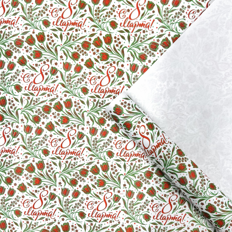 Крафт бумага 8 Марта! красный/зеленый на белом 700мм/60гр/10м ± 5%