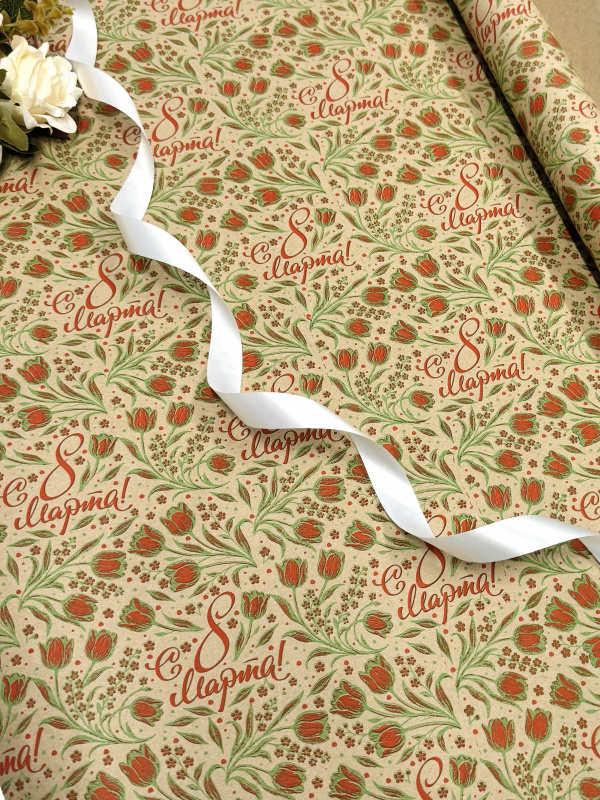 Крафт бумага 8 Марта! красный/зеленый на коричневом фоне 700мм/60гр/10м ± 5%