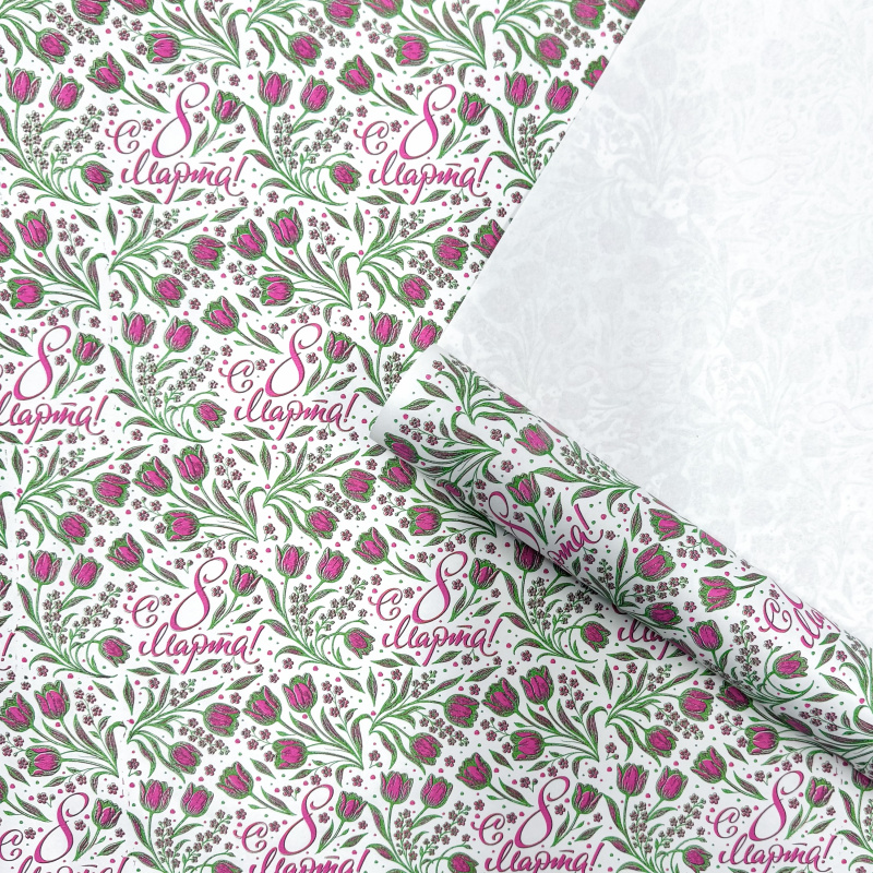 Крафт бумага 8 Марта! розовый/зеленый на белом фоне 700мм/60гр/10м ± 5%