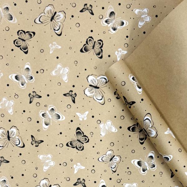 Крафт бумага Бабочки черный/белый на коричневом фоне 720мм/60гр/10м ± 5%