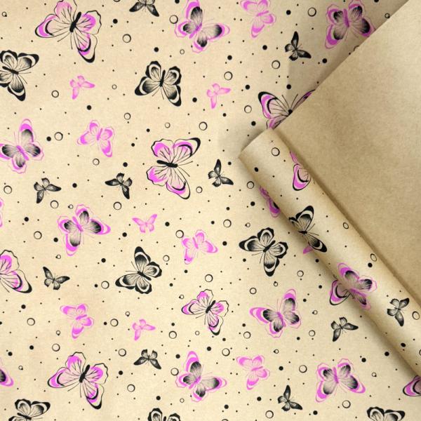 Крафт бумага Бабочки черный/розовый на коричневом фоне 720мм/60гр/10м ± 5%