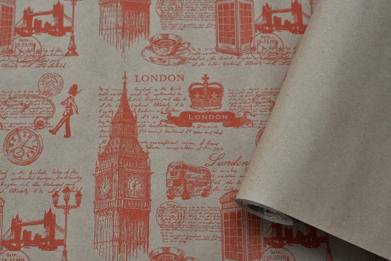 Крафт бумага "Лондон" красный на коричневом фоне 720мм/60гр/10м± 5%
