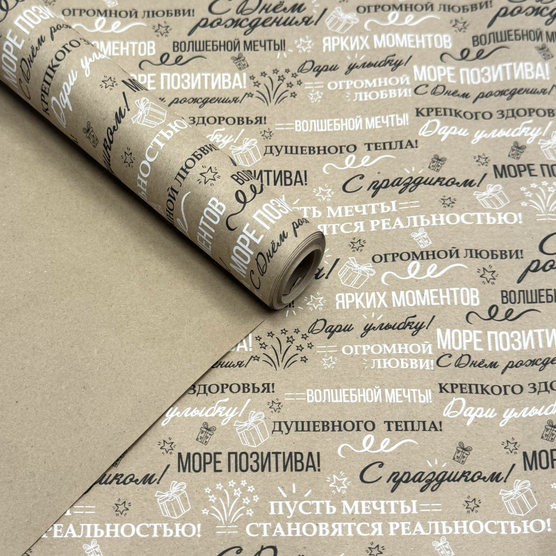 Крафт бумага С Днем Рождения! Пожелания черный/белый на коричневом 700мм/60гр/10м ± 5%