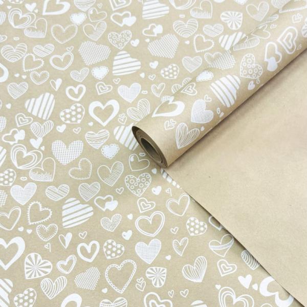 Крафт бумага Сердечное ассорти белый на коричневом фоне 720мм/60гр/10м ± 5%