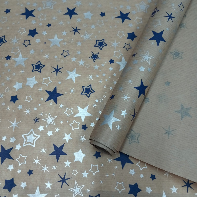 Крафт бумага Звезды голубой/серебро на коричневом фоне 720мм/40гр/10м± 5%