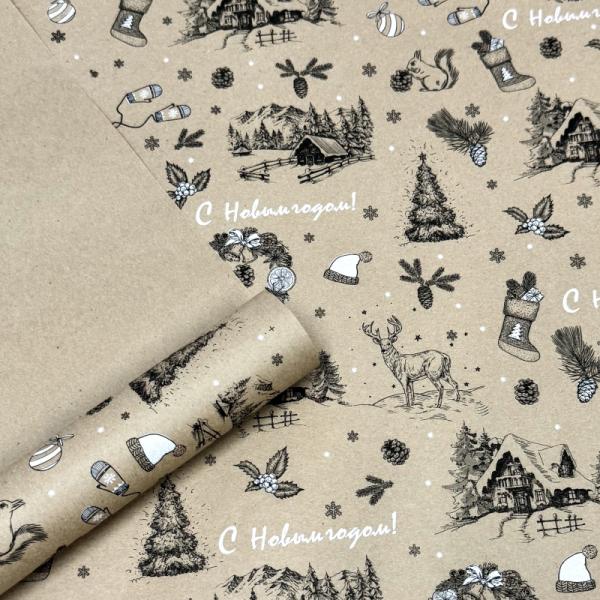 Упаковочная бумага Деревенька белый/черный на коричневом фоне 720мм/60гр/10м ± 5%