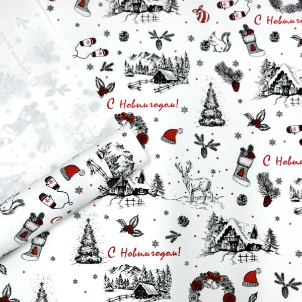 Упаковочная бумага Деревенька красный/черный на белом фоне 700мм/60гр/10м ± 5%