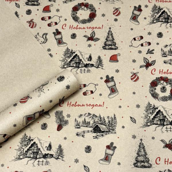 Упаковочная бумага Деревенька красный/черный на коричневом фоне 700мм/60гр/10м ± 5%