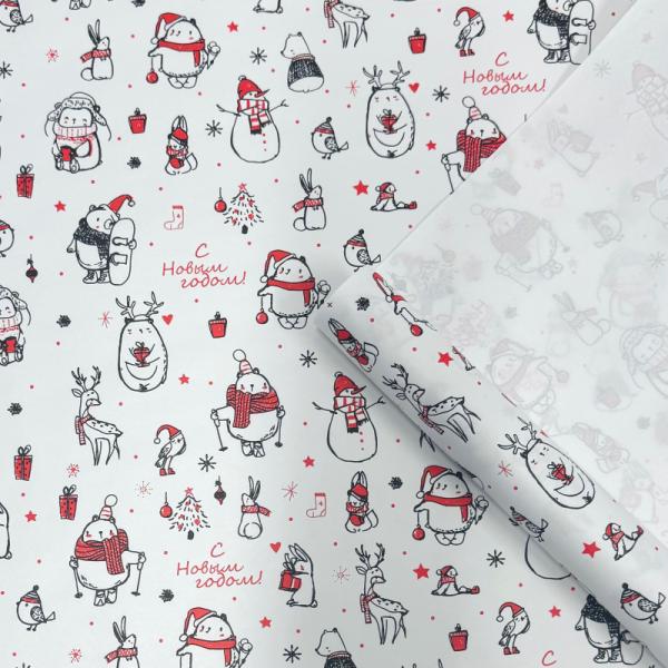 Упаковочная бумага Новогодние друзья красный/черный на белом фоне 720мм/60гр/10м ± 5%