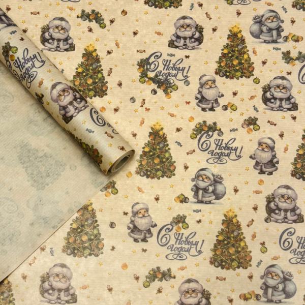 Упаковочная новогодняя бумага Дед Морозы на коричневом фоне 70см/40гр/10м± 5%