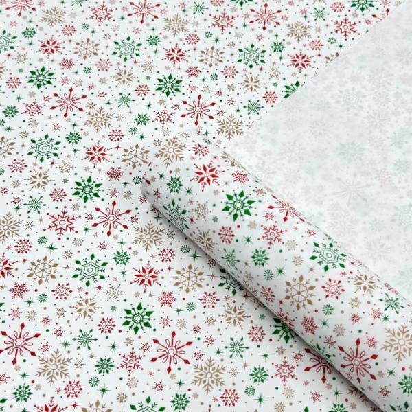 Упаковочная новогодняя бумага Снегопад красный/зеленый/золото на белом 680мм/60гр/10м ± 5%