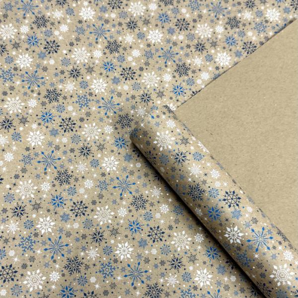 Упаковочная новогодняя бумага Снегопад синий/голубой/белый на коричневом 680мм/60гр/10м ± 5%