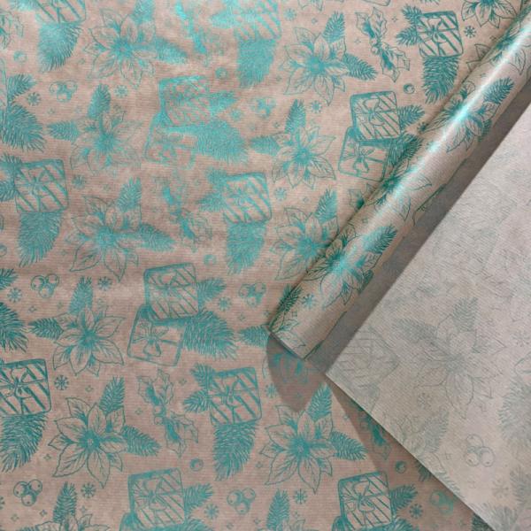 Упаковочная новогодняя бумага "Цветы" перламутровый изумруд на коричневом 68см/40пл/10м
