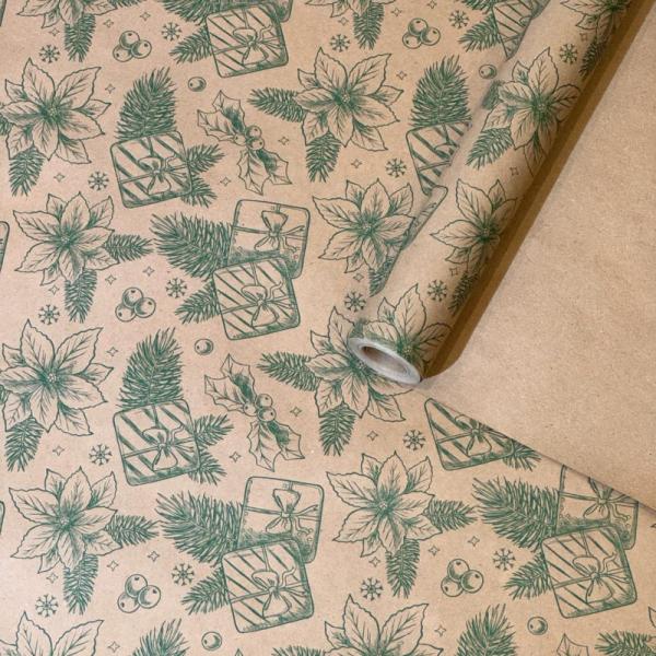 Упаковочная новогодняя бумага "Цветы" зеленая на коричневом 68см/60пл/10м