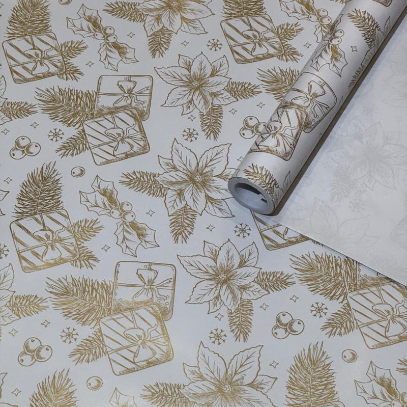 Упаковочная новогодняя бумага "Цветы" золотая на белом мелованном фоне 68см/60пл/10м