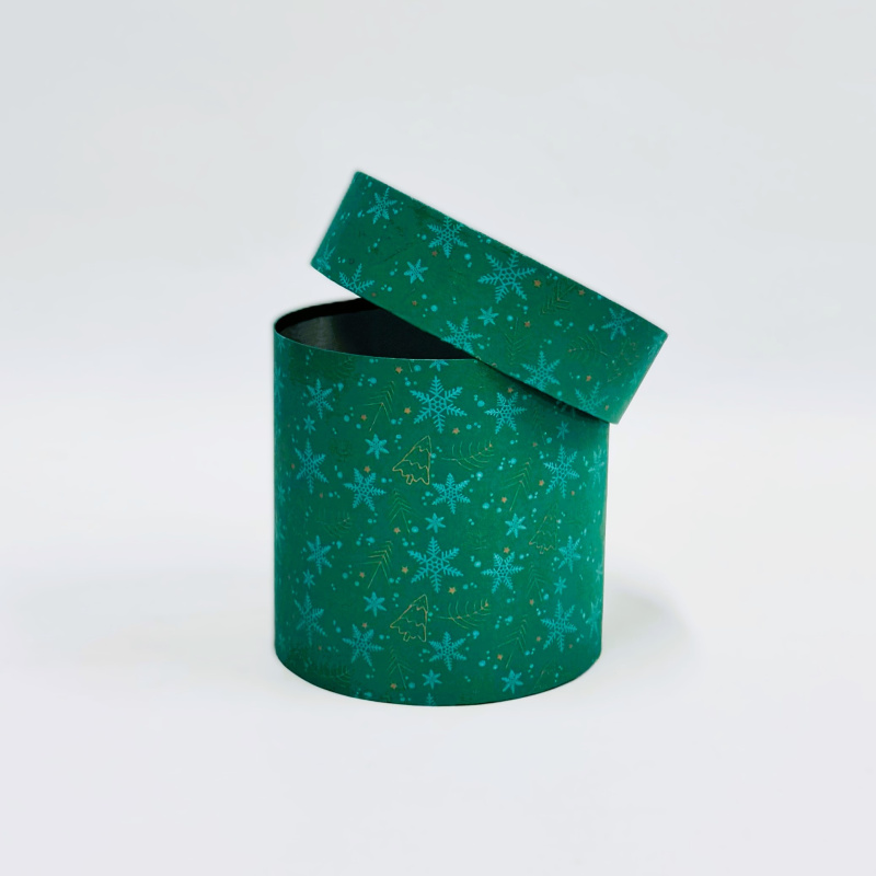 Коробка круглая 13,5*13,5 .зеленый/новогодний рисунок ёлочки