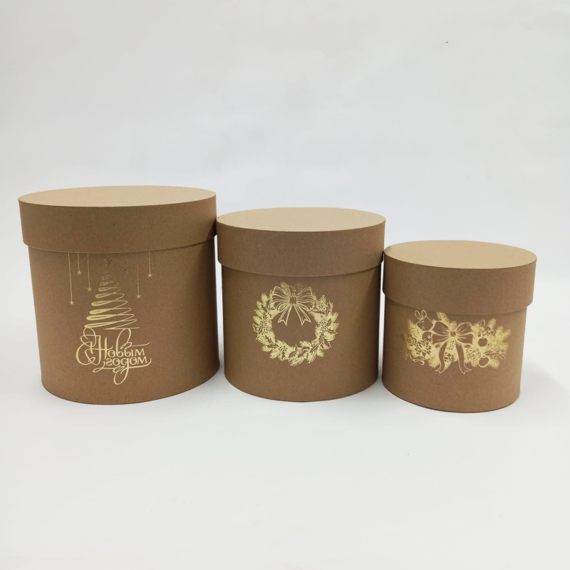 Набор шляпных коробок 3в1 крафт с тиснением НГ золото,18*18/16*16/13*13
