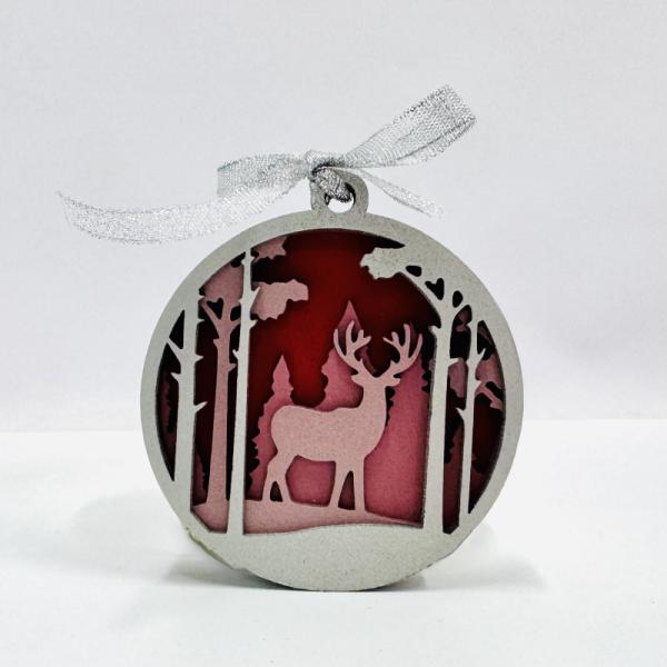 Игрушка новогодняя четырехслойная "Олень в лесу" красная/серебро 90 мм