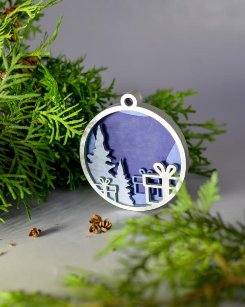 Игрушка новогодняя четырехслойная "Подарки" синяя/серебро 90 мм