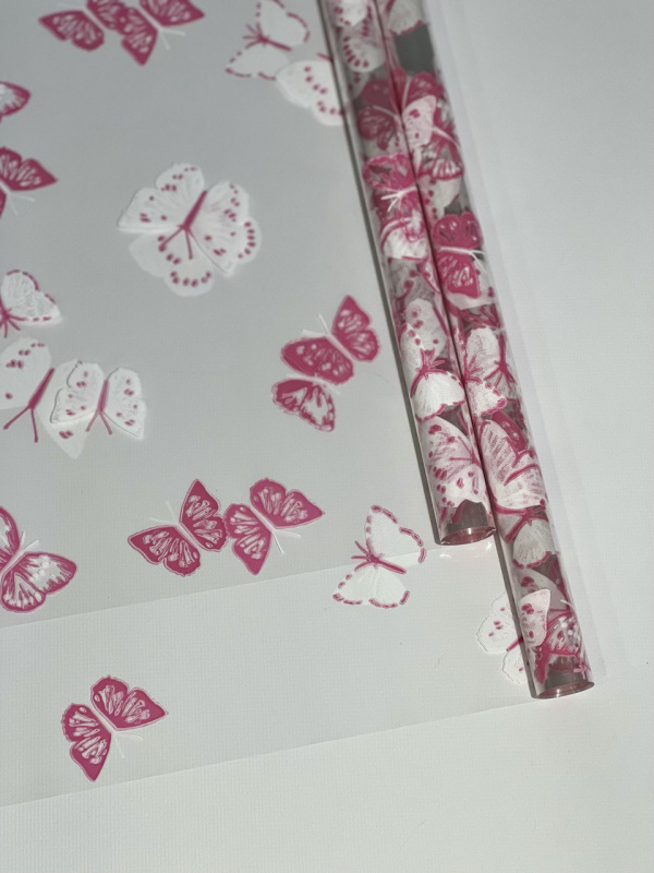 Пленка прозрачная двухцветная с рисунком Бабочки бело-розовая 70см*200гр ± 5%