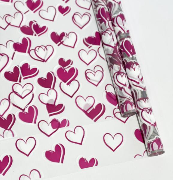 Пленка прозрачная двухцветная с рисунком Сердечки бело-фуксия 70см*10ярд ± 5%