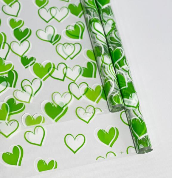 Пленка прозрачная двухцветная с рисунком Сердечки бело-салатовая 70см*10ярд ± 5%